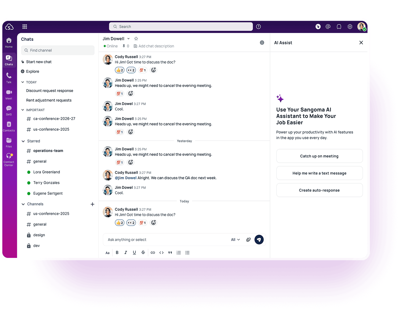 Keep your customers happy with the help of Sangoma CX AI Assist. Support your agents in real time, suggesting replies, improving drafts, and adjusting tone across digital channels like SMS, WhatsApp, and email.